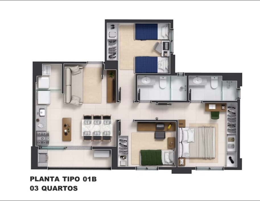 •  Quartos: 3 quartos bem distribuídos sendo 1 Suíte